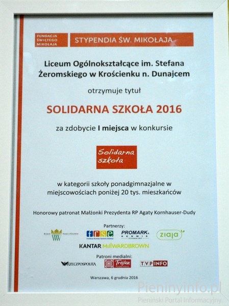 Nasze Liceum również otrzymało zaproszenie na Galę, ale tym razem nie wiedzieliśmy, czy otrzymamy Wyróżnienie, czy tytuł Solidarnej Szkoły. Wysiłek naszych wolontariuszy został doceniony, udało nam się obronić tytuł Solidarna Szkoła 2015 i obecnie możemy pochwalić się kolejnym certyfikatem na rok 2016! Wygraliśmy w kategorii: szkoły ponadgimnazjalne w miejscowościach do 20 tys. mieszkańców, gromadząc na naszym koncie niebagatelną kwotę 11 631,30 zł, co stanowiło najwyższą kwotą uzbieraną przez jedną szkołę wśród wszystkich kategorii.