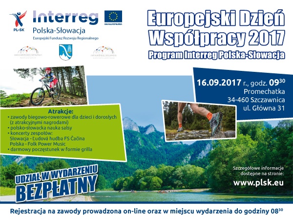 16 września 2017 roku zapraszamy do wspólnych obchodów Europejskiego Dnia Współpracy 2017 organizowanego przez program Interreg V-A Polska Słowacja. Wydarzenie ma charakterze plenerowy i rozpocznie się o godzinie 9:30 na terenie Centrum kultury i rekreacji Promechatka (ulica Główna 31, Szczawnica).