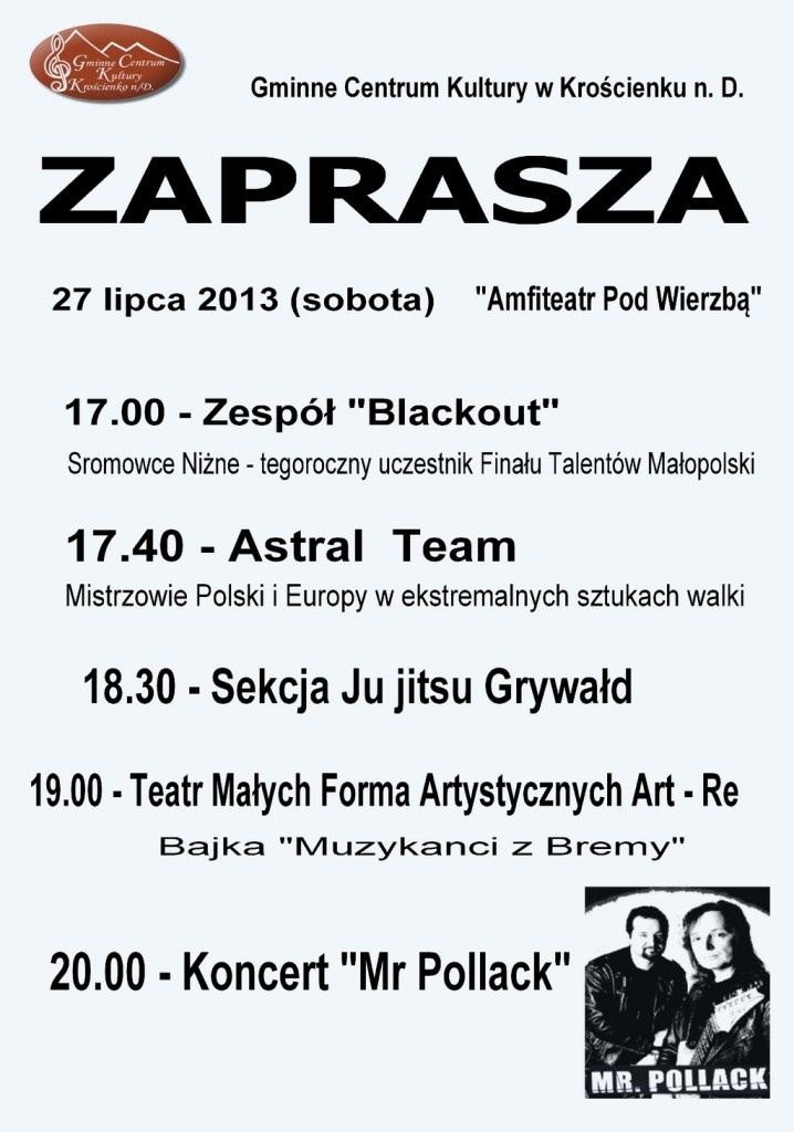 W najbliższą sobotę 27 lipca, Gminne Centrum Kultury zaprasza na wspólną zabawę z Zespołem Blackout, Mr Pollack oraz do obejrzenia widowiska "Muzykanci z Bremy" w wykonaniu Teatru Art-Re. W programie pokaz ekstremalnej sztuki walki Mistrzów Polski i Europy.
