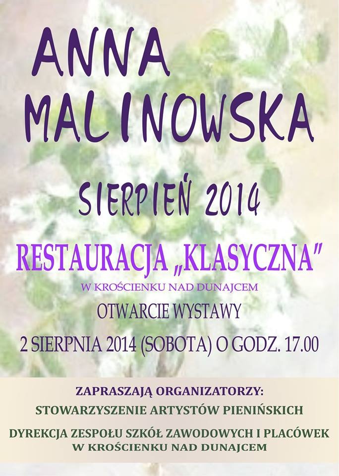 Stowarzyszenie Artystów Pienińskich oraz Dyrekcja Zespołu Szkół Zawodowych i Placówek z Krościenka n/D zapraszają na wystawę prac artystki Anny Malinowskiej. Ekspozycja czynna od soboty 02. sierpnia w Restauracji Klasyczna w Krościenku n/D.