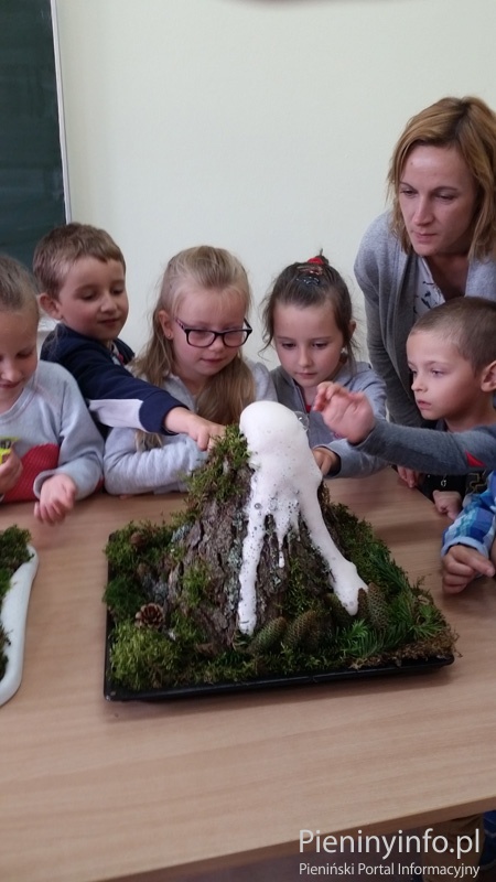 Przedszkolaki z wielkim entuzjazmem obserwowały i pomagały w doświadczeniach, a wyrazy ich twarzy świadczyły o tym, że nie doskwierała im nuda. By ich krótki pobyt w naszej szkole był jeszcze bardziej ciekawy, uczennice pod opieką Pani Natalii Regiec – (nauczycielki geografii) wykonały i przygotowały pokaz wybuchu wulkanu. Maluchy ciekawe świata mogły się dowiedzieć: Co to jest wulkan? Dlaczego wybucha? Co z niego wypływa? By nie było tak poważnie, nasi wspaniali gimnazjaliści pomyśleli również o wspólnych zabawach, do których prowadzenia przygotowali się na najwyższym poziomie.