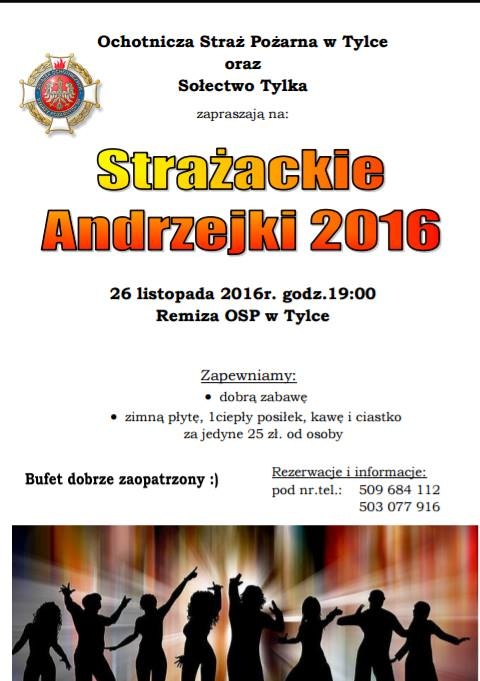 Ochotnicza Straż Pożarna w Tylce oraz Sołectwo Tylka zaprasza do wspólnej zabawy mieszkańców i gości w andrzejkowy wieczór 26 listopada 2016 roku od godziny 19.00.